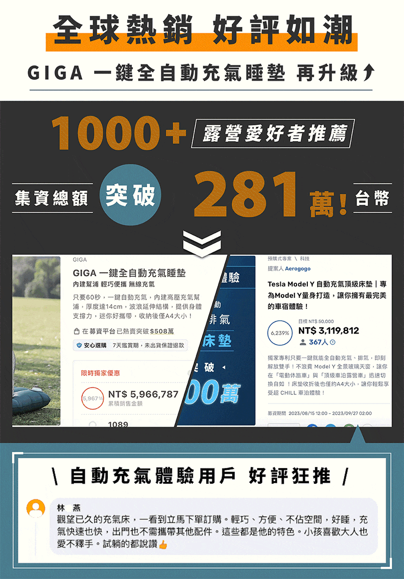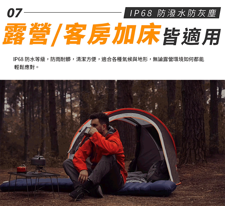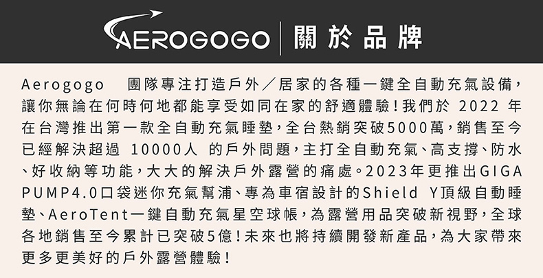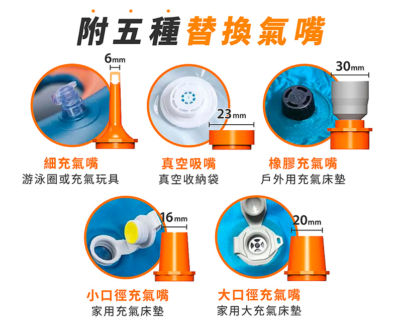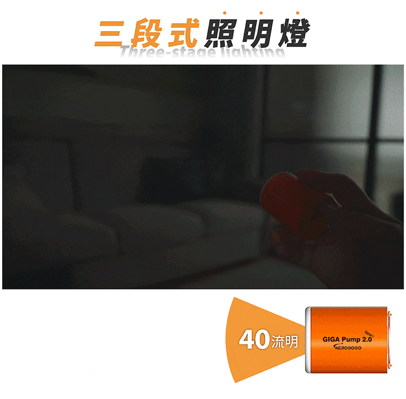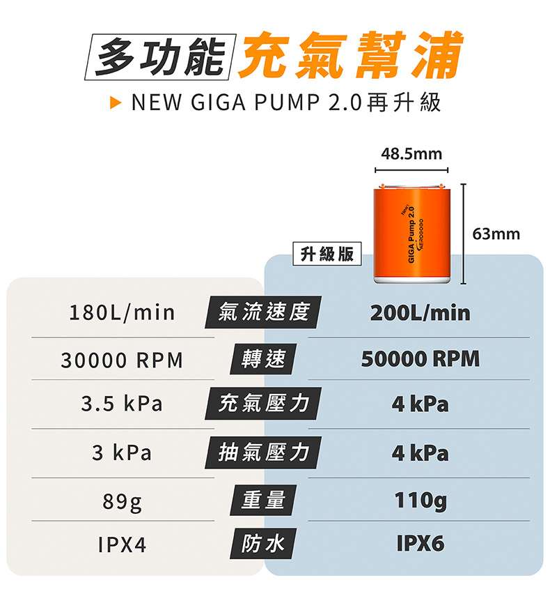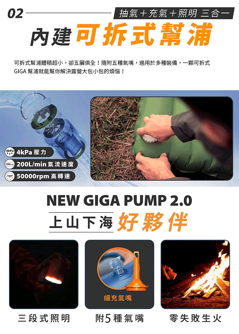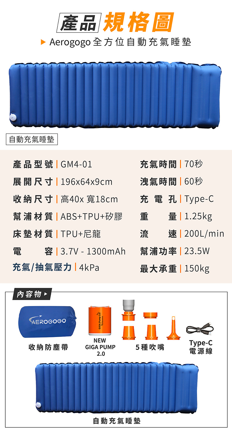 產品內容物 : 收納防塵袋x1、GIGA PUMP2.0(含5種吹嘴)x1、Type-C電源線x1、自動充氣睡墊x1
