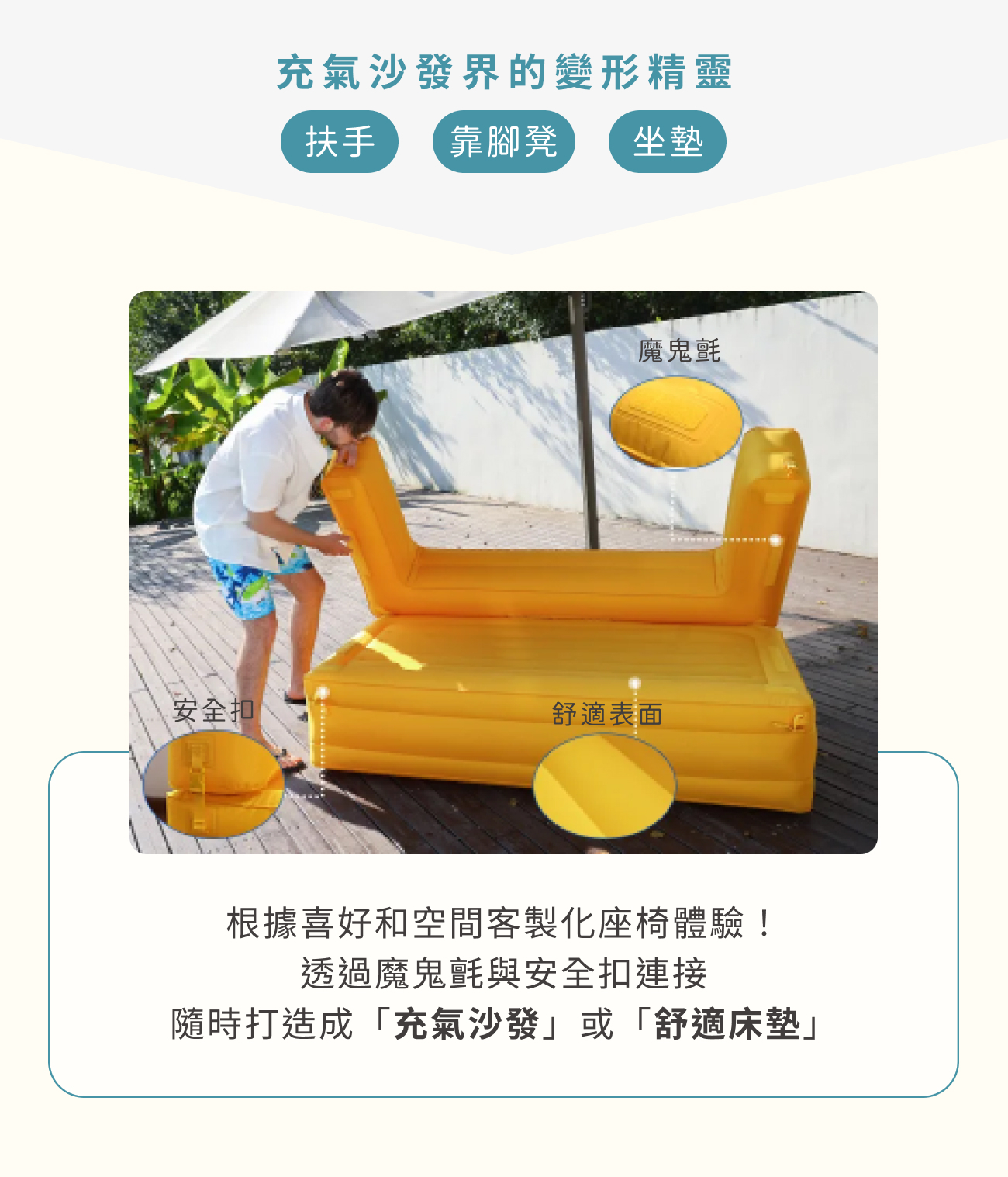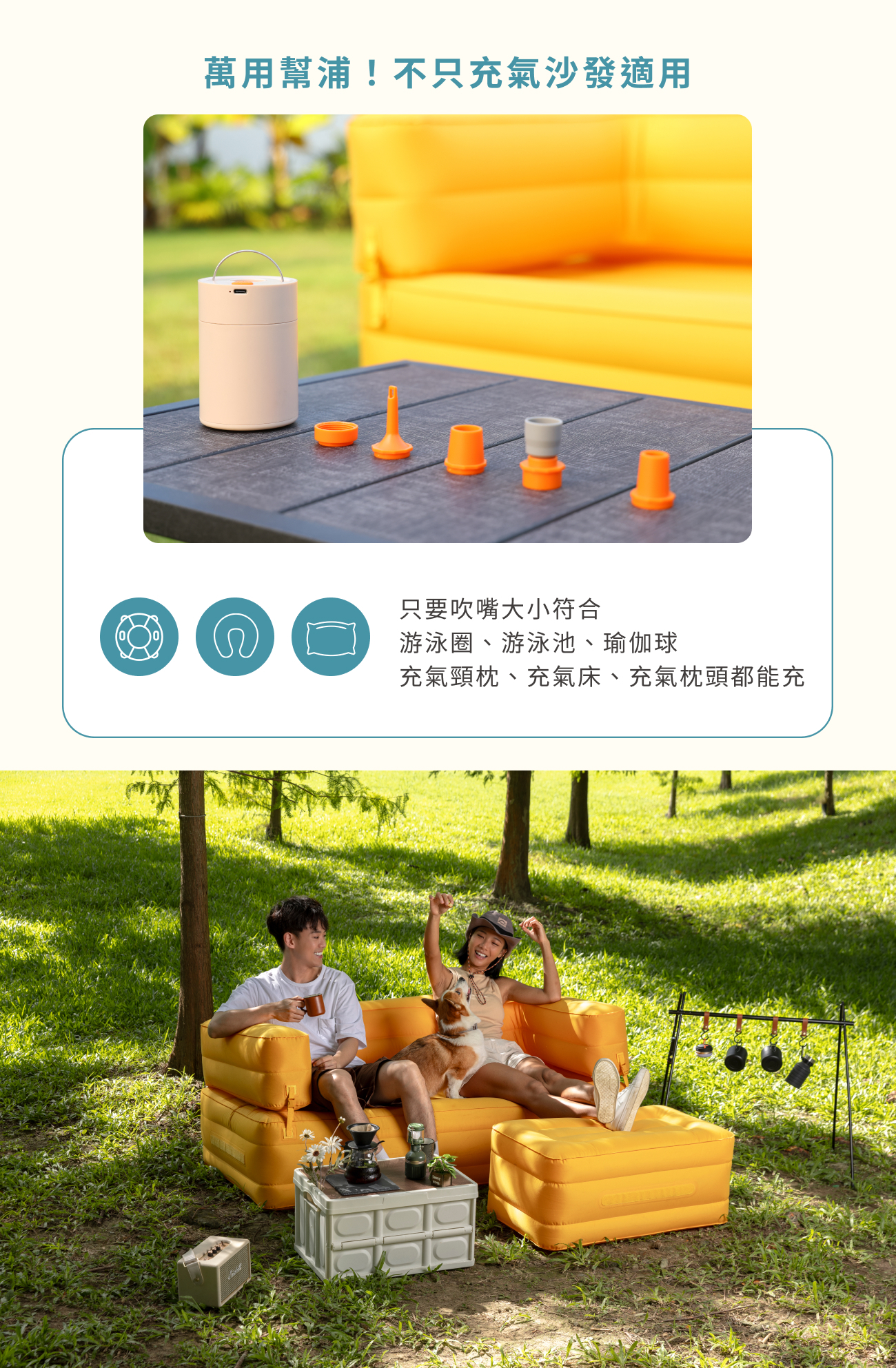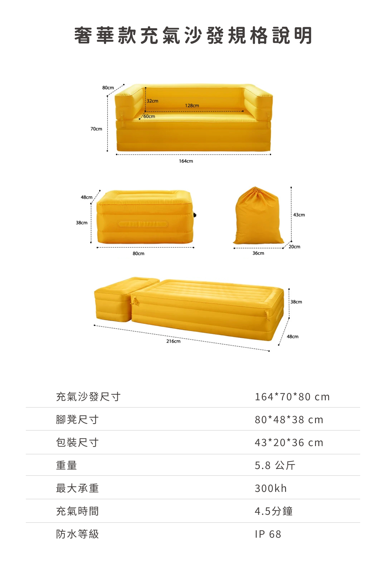 內容物:奢華雙人充氣沙發*1、分離坐墊*1、收納袋*1、修補片*2、TYPEC充電線*1、充氣幫浦*1、氣嘴(5個)一組*1、真空收納袋*1