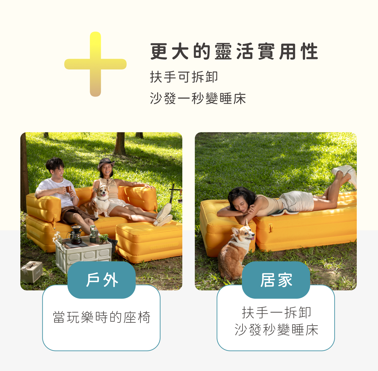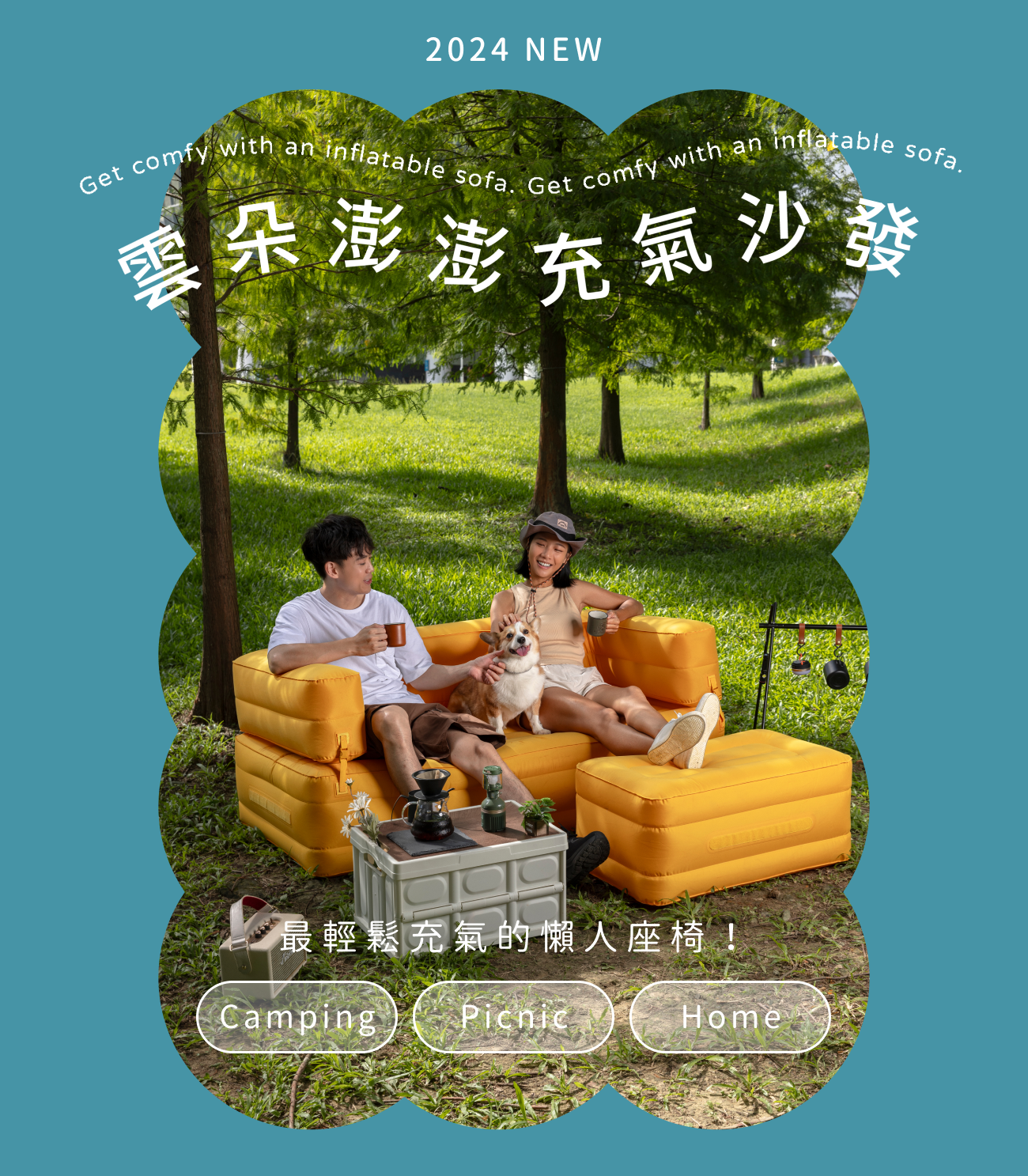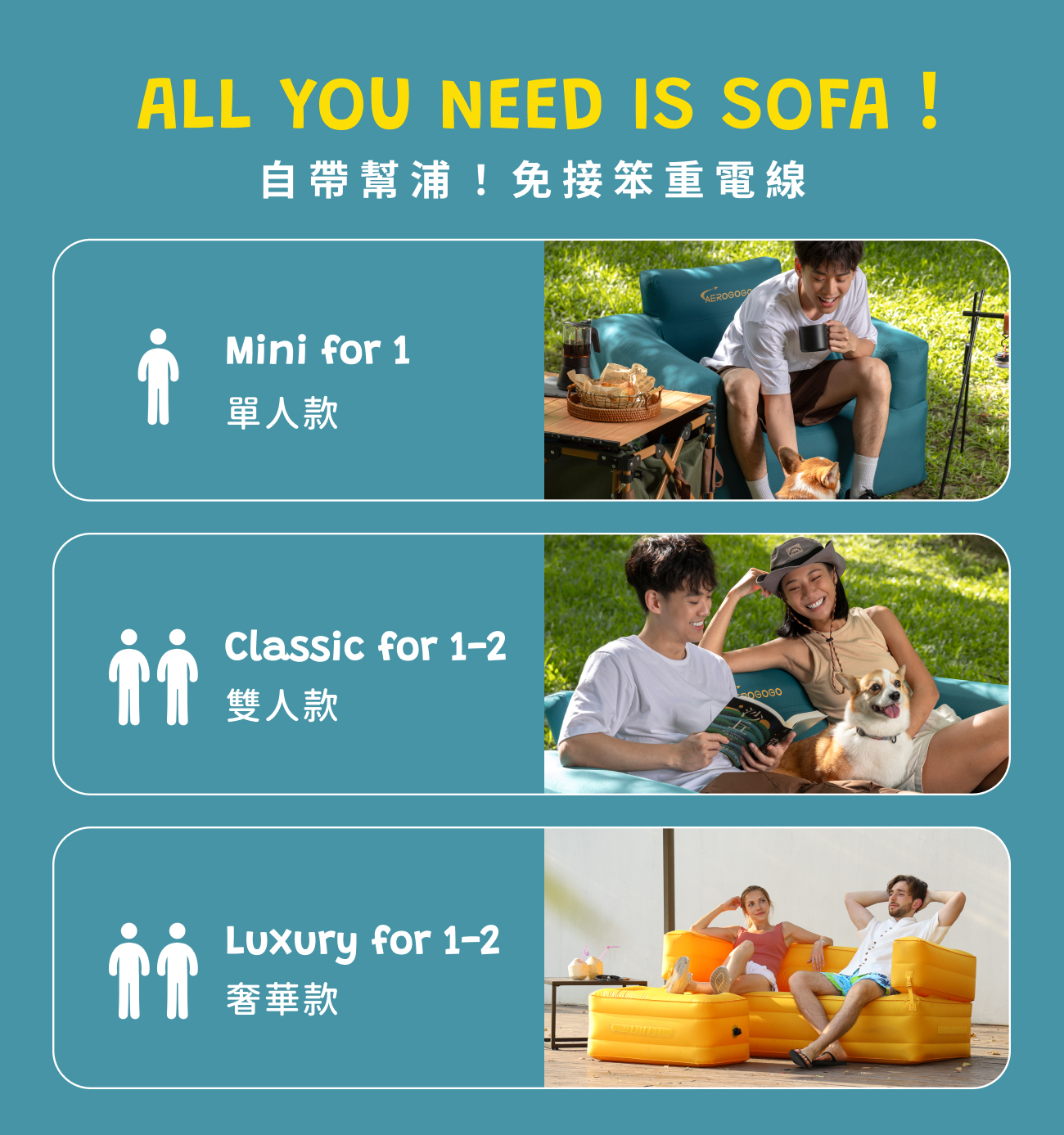 內容物:奢華雙人充氣沙發*1、分離坐墊*1、收納袋*1、修補片*2、TYPEC充電線*1、充氣幫浦*1、氣嘴(5個)一組*1、真空收納袋*1