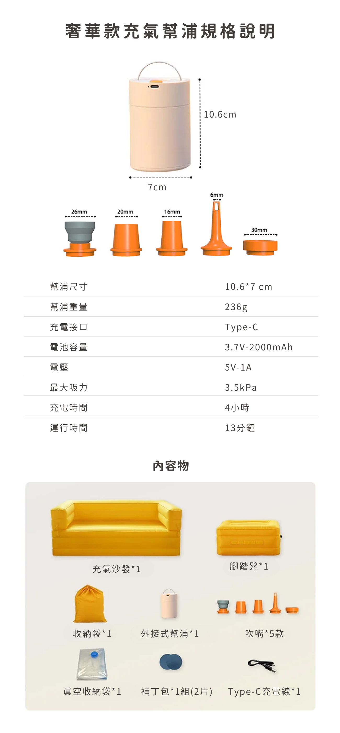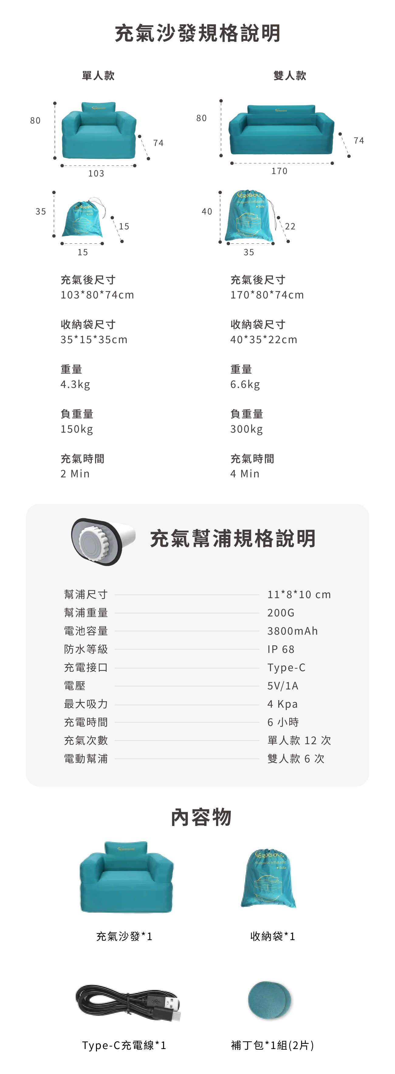 內容物:單人充氣沙發*1、收納袋*1、修補片*2、TYPEC充電線*1