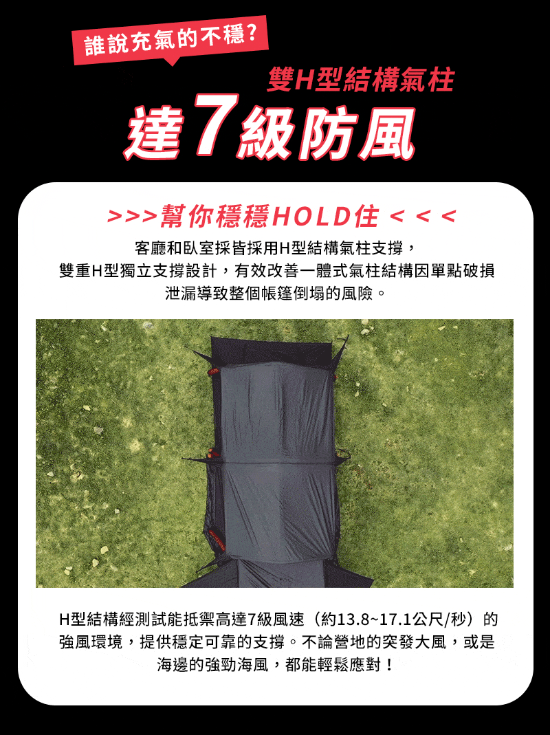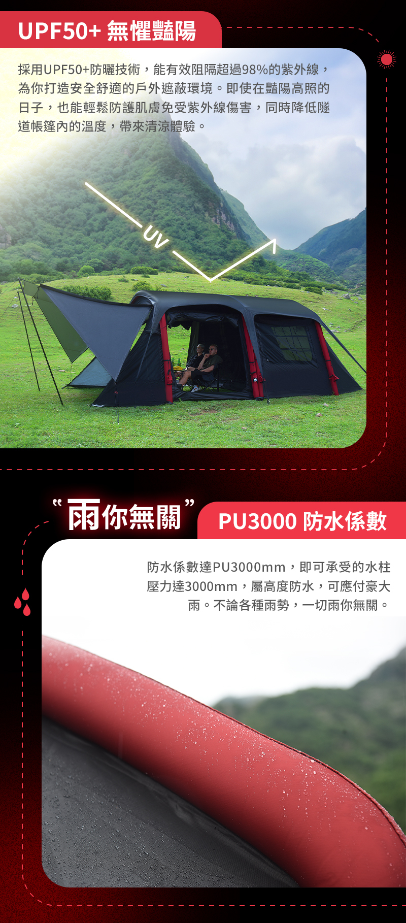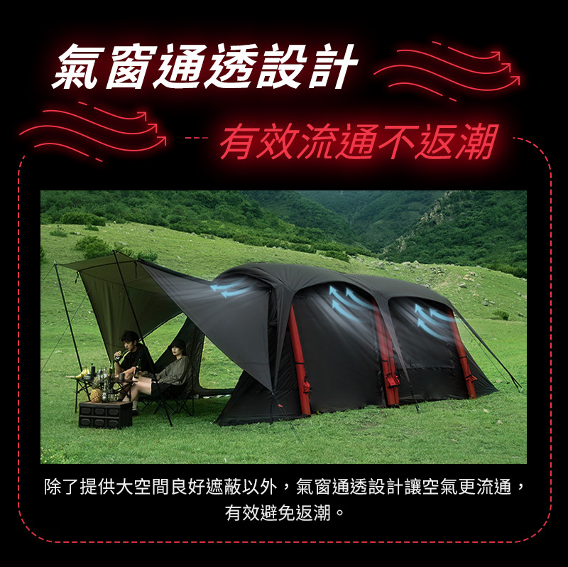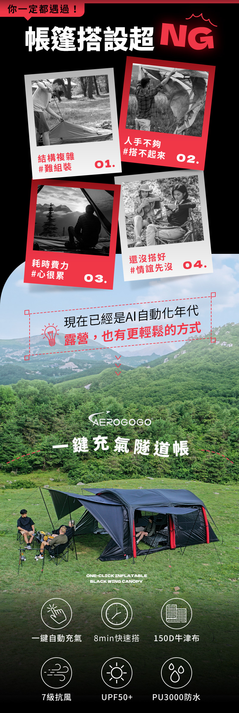 3.搭設前以及收納時請務必確認周遭無尖銳物品,避免刺穿帳篷以及氣柱結構。