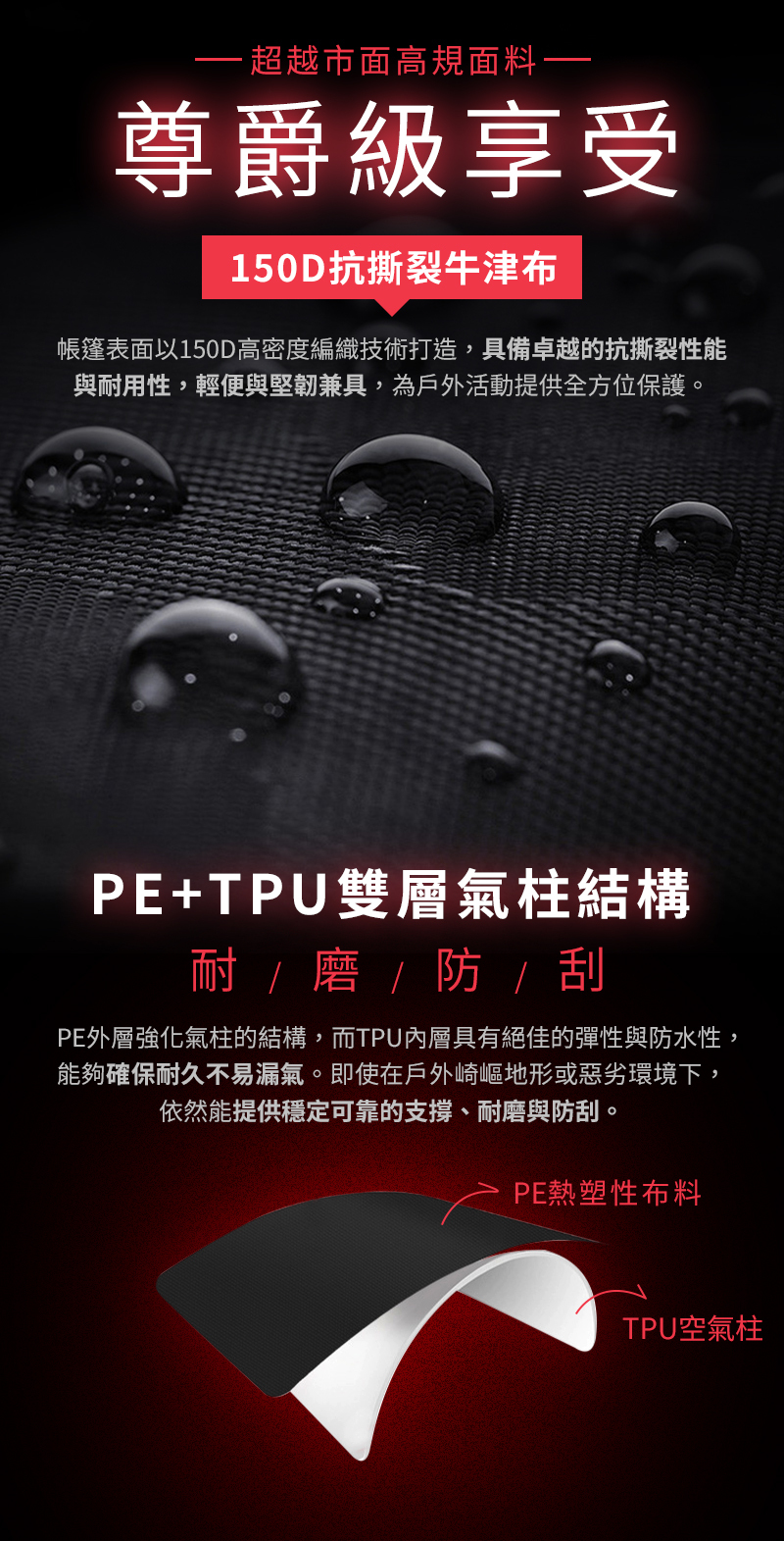 外層帳布材質:150D牛津防撕面料(黑色PU塗層)