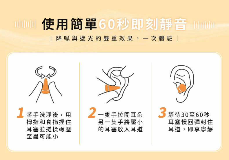 1.洗手後用拇指和食指捏住耳塞滾動捻壓至最小