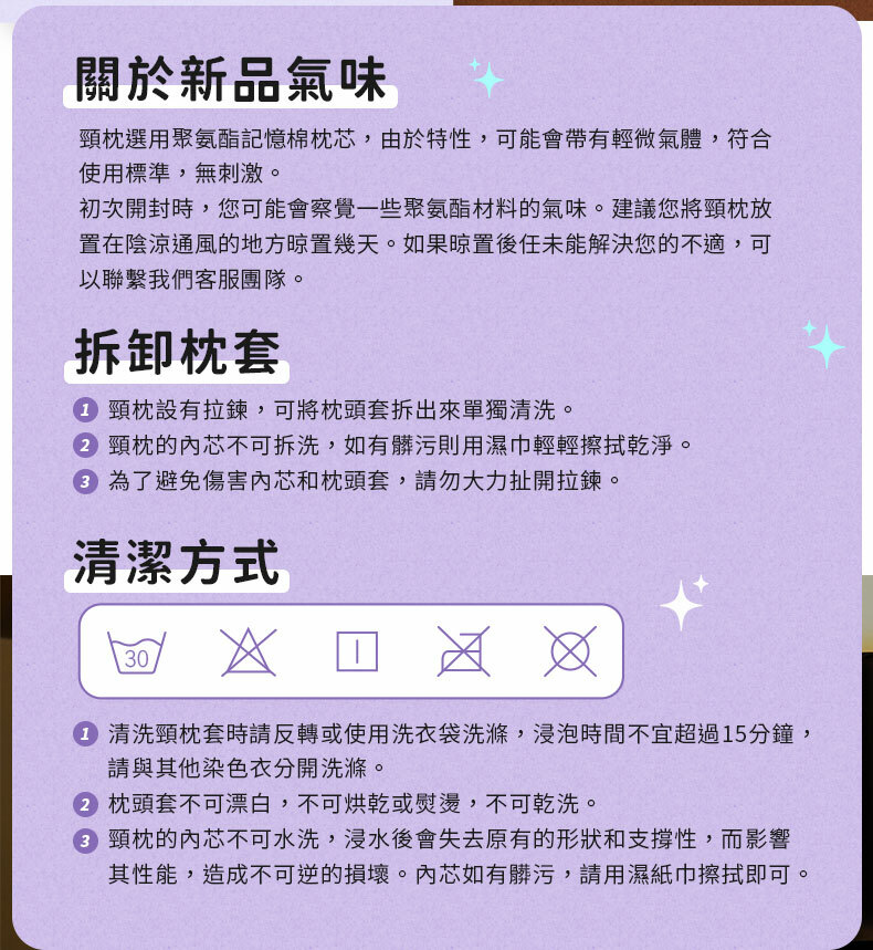 2.枕套可水洗、不可漂白、不可烘乾、禁止使用熨斗、不可乾洗。