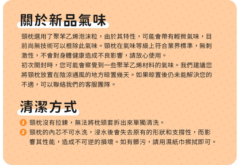 3.泡沫粒子頸枕內枕不可水洗,浸水後會失去原有形狀和支撐性,從而影響使用性能,造成不可逆的損壞,內枕如有髒汙,請用濕紙巾擦拭。