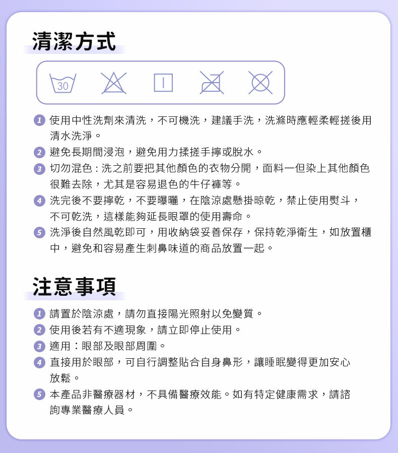 3. 晾曬方法 : 洗完後不要擰乾,不要曝曬,在陰涼處懸掛晾乾,禁止使用熨斗。不可乾洗,這樣能夠延長眼罩的使用壽命。