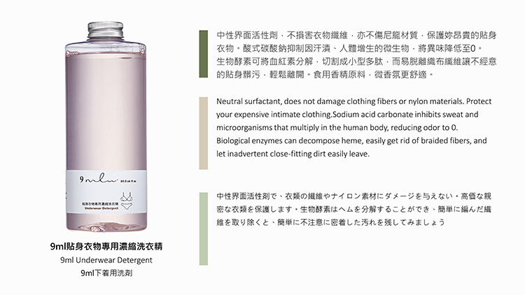 ◇中性界面活性劑,不損害衣物纖維、尼龍材質,保護妳昂貴的貼身衣物。