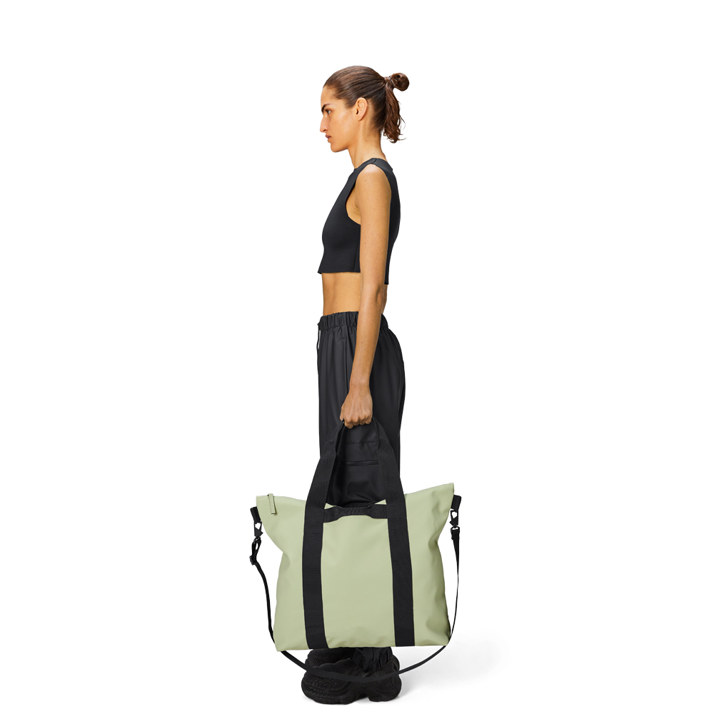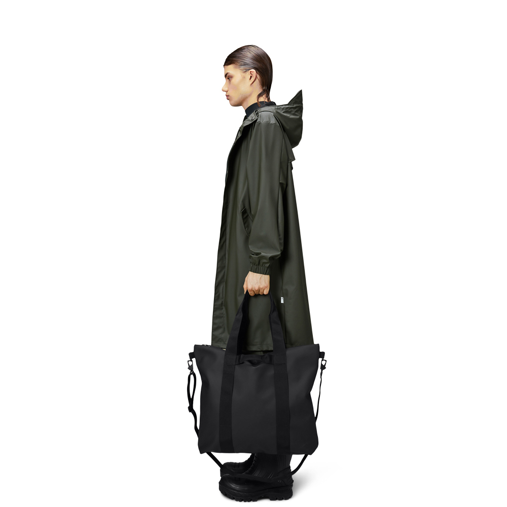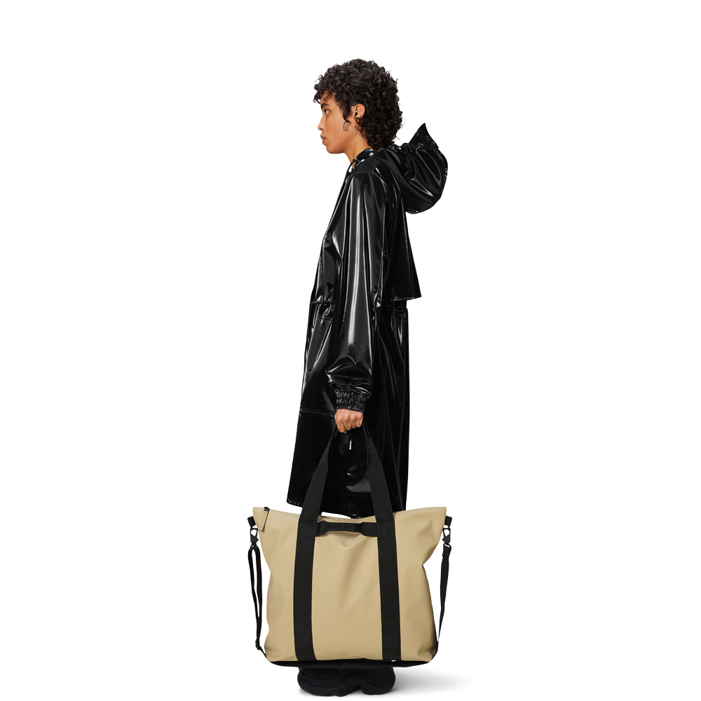 Tote Bag 經典防水休閒托特包是滿足購物、通勤或上班用途的防水必備包款。該設計以低調的機能性細節點綴,打造兼具高級與實用性的造型。拉開防水塗層拉鍊可見寬敞的主要空間及拉鍊內袋,透過可拆卸式肩帶、手提把手或側提把變換多種攜帶方式,同時配有扣環以方便將鑰匙等小型物件與其相扣。