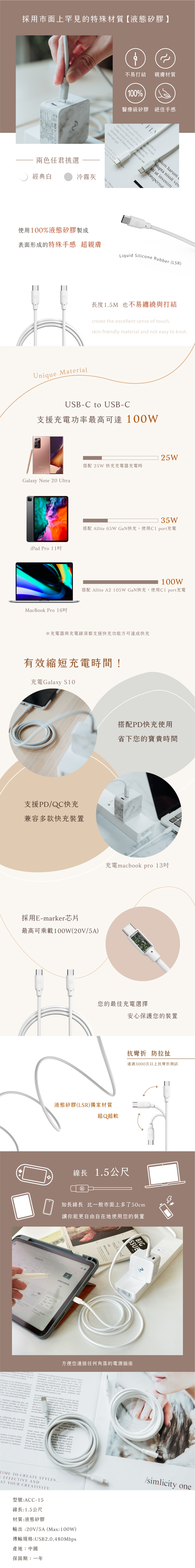 品名:Allite 1.5 M 液態矽膠充電線(USB-C to USB-C)- 經典白/冷霧灰