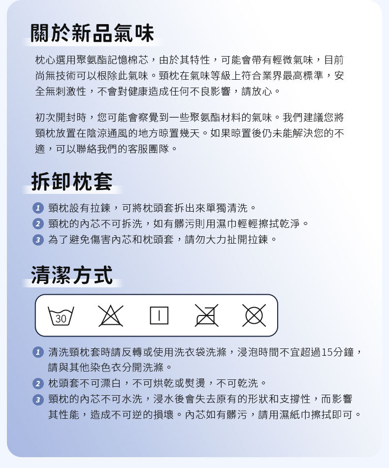 2.枕頭套不可漂白,不可烘乾或熨燙,不可乾洗。