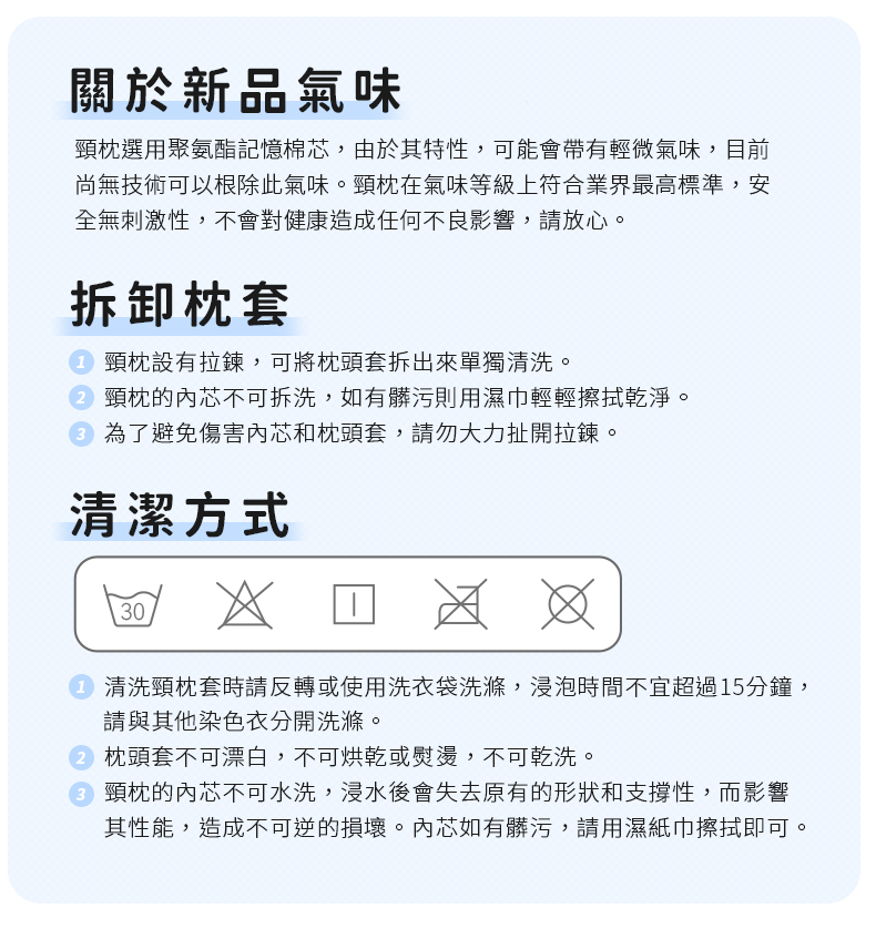 2. 頸枕的內芯不可拆洗,如有髒污則用濕紙巾輕輕擦拭乾淨。