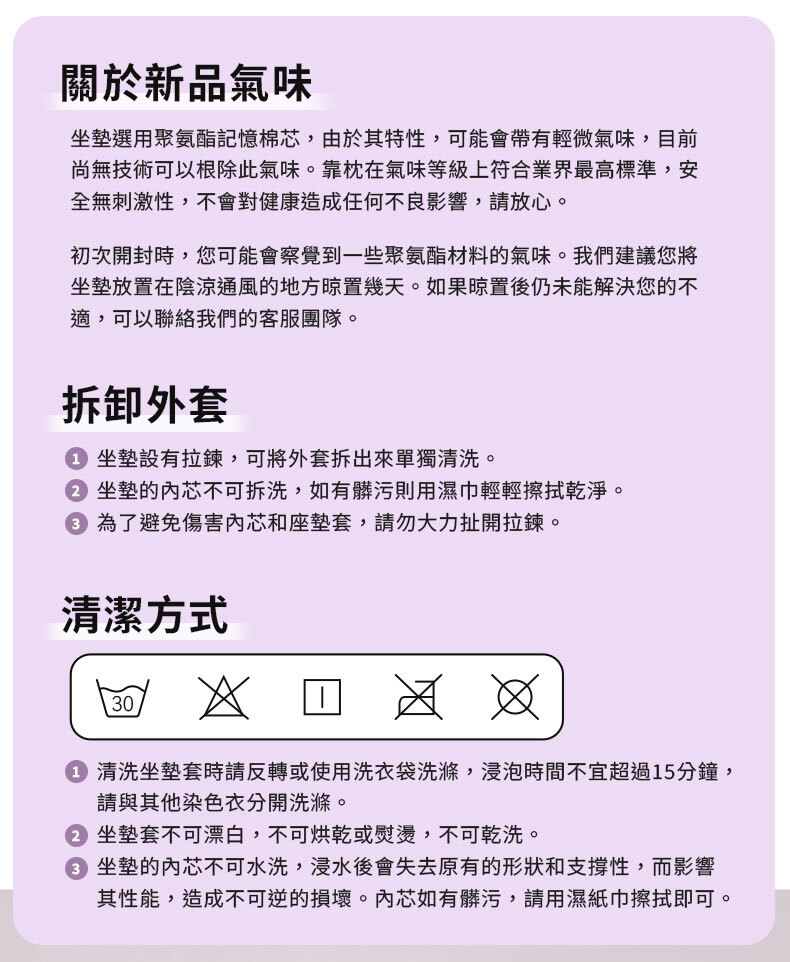 1. 清洗坐墊時,請反轉或使用洗衣袋進行洗滌,浸泡時間不宜超過15分鐘,請與其他染色衣物分開洗滌。