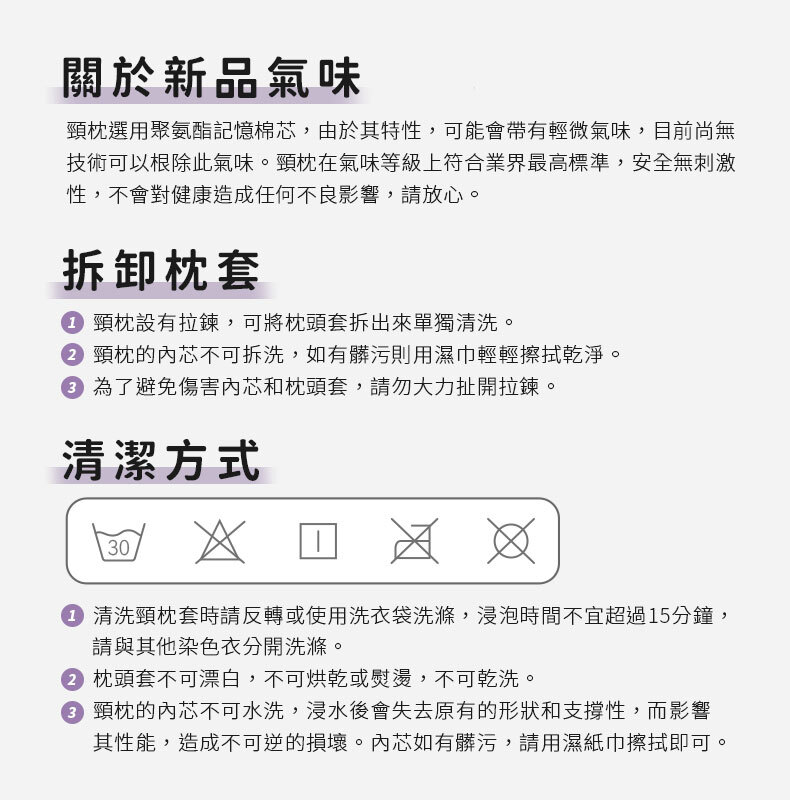 2. 頸枕的內芯不可拆洗,如有髒污則用濕紙巾輕輕擦拭乾淨。