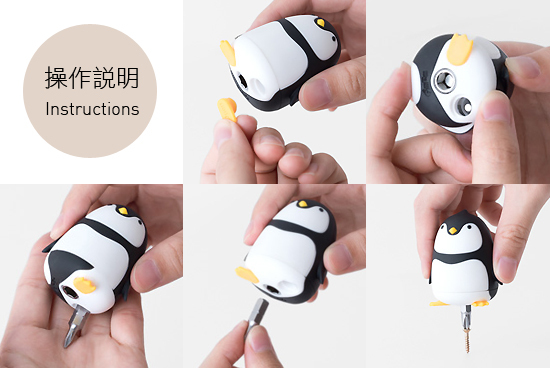 內容物:企鵝螺絲起子握把1只、1/4", 25mm 螺絲起子頭、十字 ⊕ #0 ,#2 各1、一字 ϴ 2.5,4 mm 各1、六角 4 ,5 mm各1 (全部共6支)