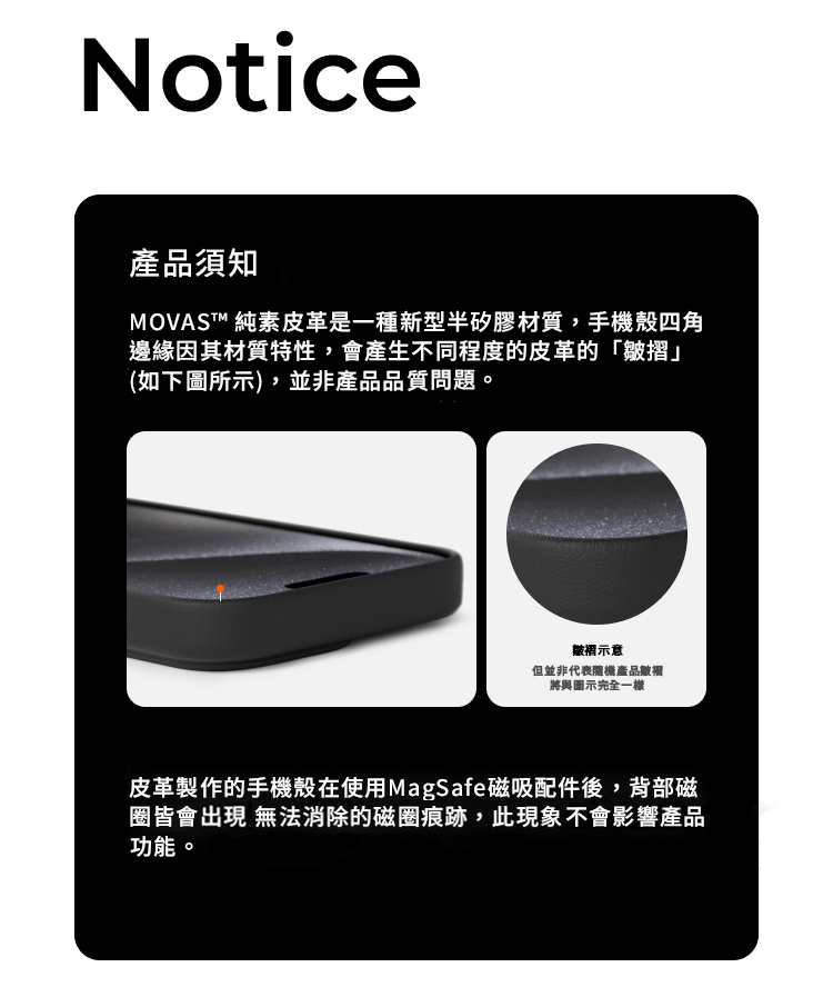 Q5:使用 MagSafe 配件會在 MOVAS™ 皮革殼上留下磁圈印嗎?