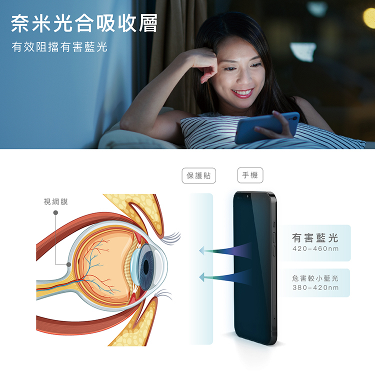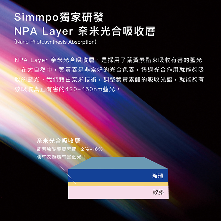 ◇獨家研發 NPA Layer 奈米光合吸收層,吸收420-460nm藍光。