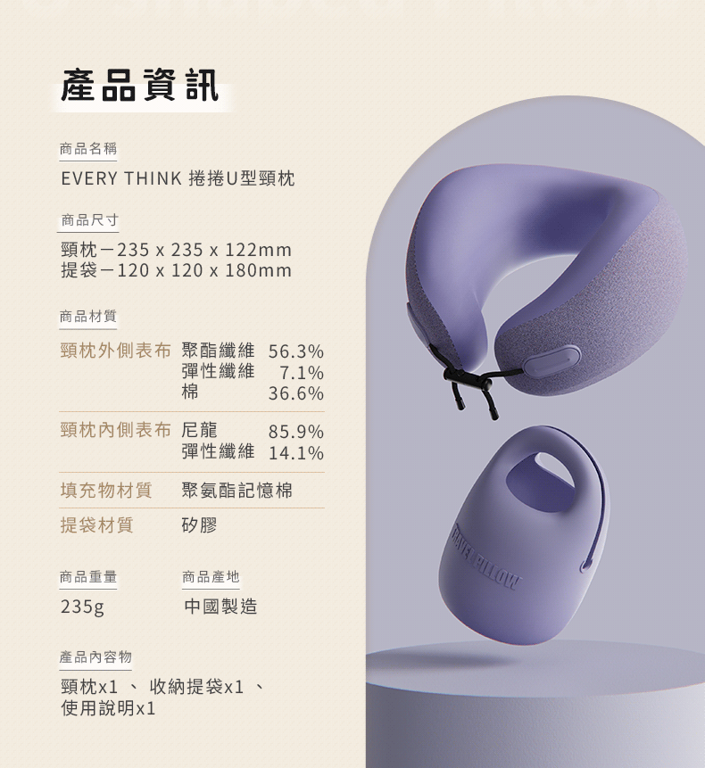 頸枕材質:外側表布 : 聚酯纖維56.3%,彈性纖維7.1%,棉 36.6%