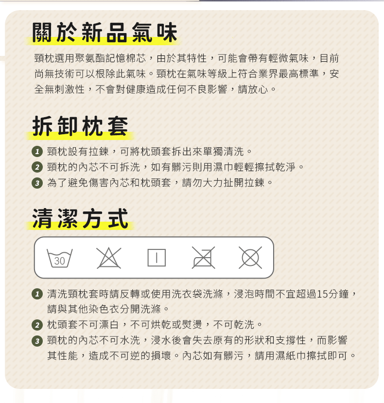 2.枕套可水洗、不可漂白、不可烘乾、禁止使用熨斗、不可乾洗